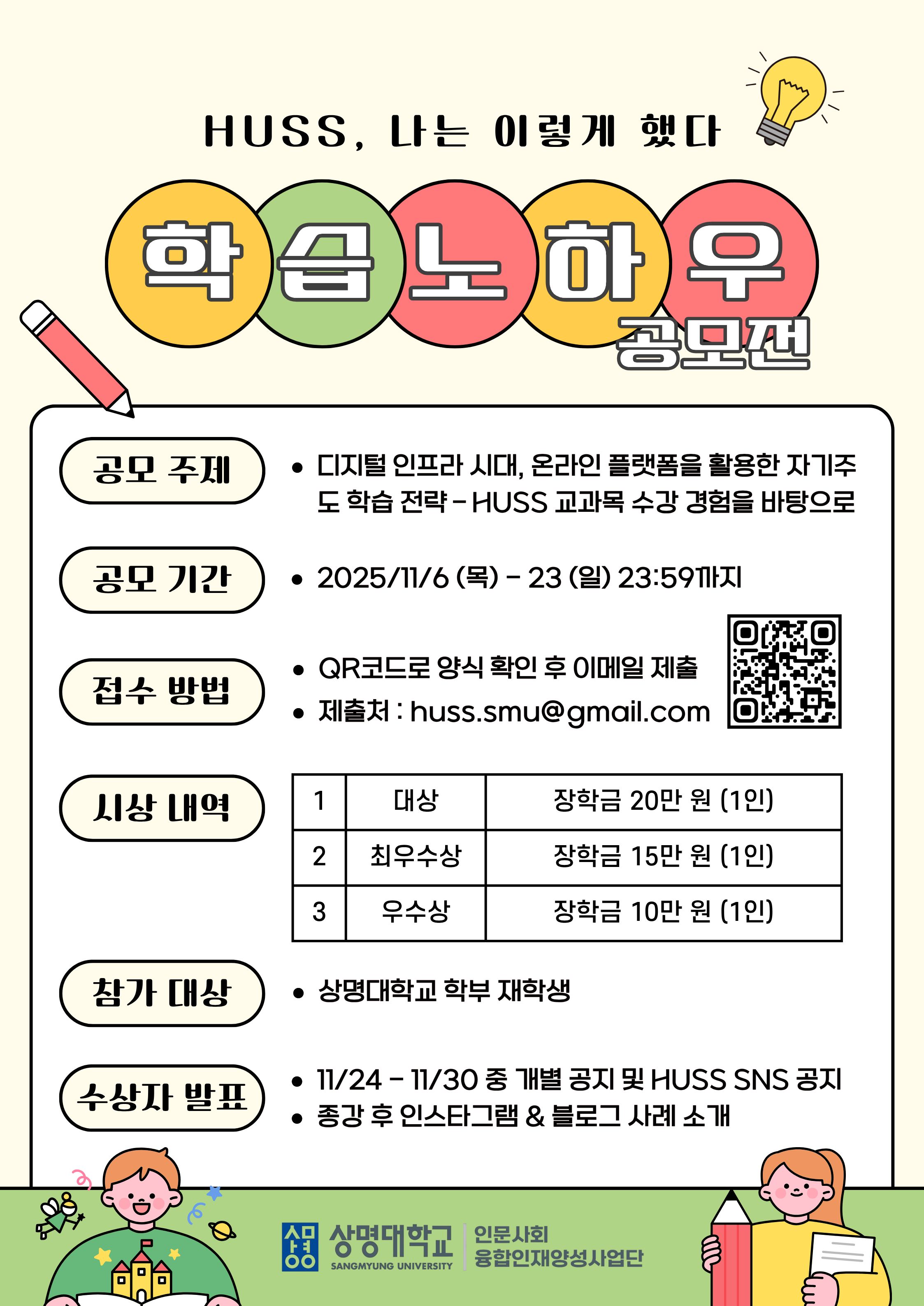▶ 접수방법: 포스터 내 QR코드를 통해 신청 양식 확인 후 이메일 제출 (제출처: huss.smu@gmail.com)